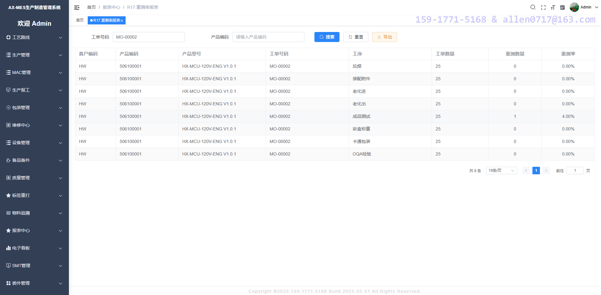通过产品产品编码与工单号码 查询 每一个工序的重测率。