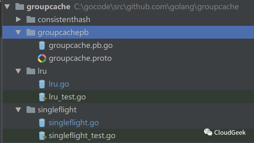 从groupcache的项目目录结构看,我们今天要学习groupcachepb、lru、singleflight这3个package: