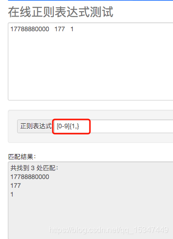 2.{n,}的用法,如下图所示,可以匹配出来三个,因为表示最少出现一次