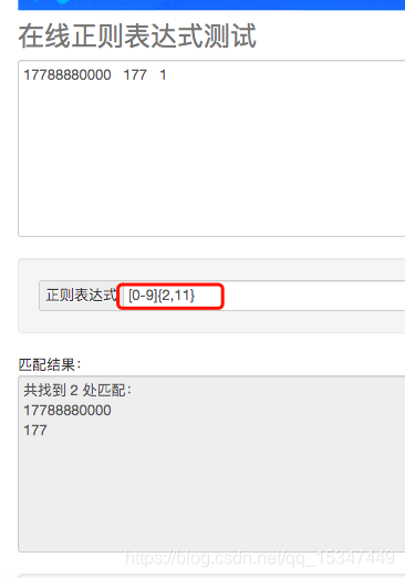 3.{n,m}用法,如下图,表示至少出现两次,最多11次,因为"1"只出现一次,不符合条件,所以只匹配到两个结果