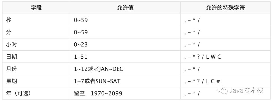 例如:子表达式(天(星期))可以为 “MON-FRI”,“MON,WED,FRI”,“MON-WED,SAT”