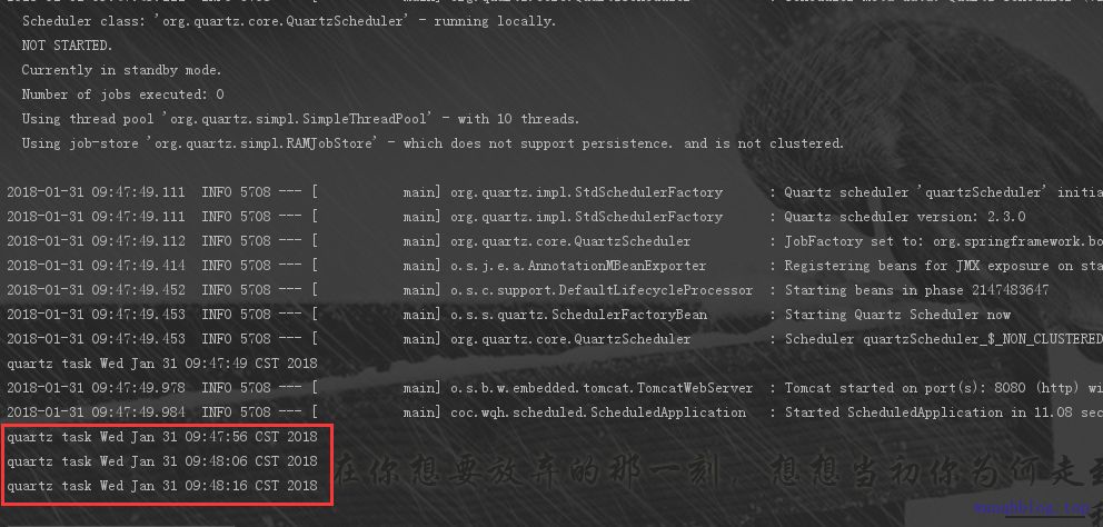 上面都是简单的介绍了关于SpringBoot定时任务的处理,直接使用SpringTask注解的方式应该是最方便的,而使用Quartz从2.0开始也变得很方便。
