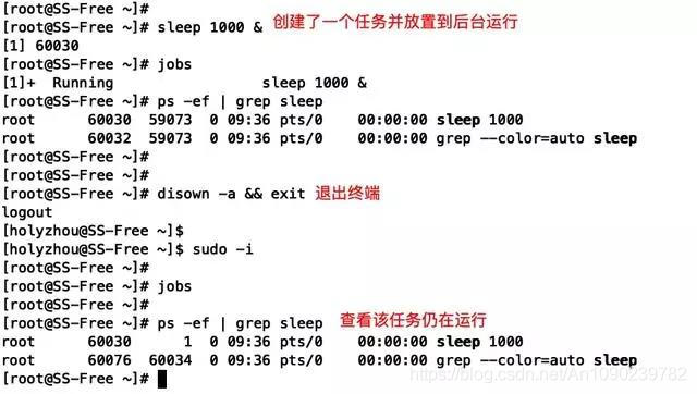 命令用法:移出最近一个正在执行的后台任务$ disown# 移出所有正在执行的后台任务$ disown -r移出所有后台任务$ disown -a# 不移出后台任务,但是让它们不会收到SIGHUP信号$ disown -h
