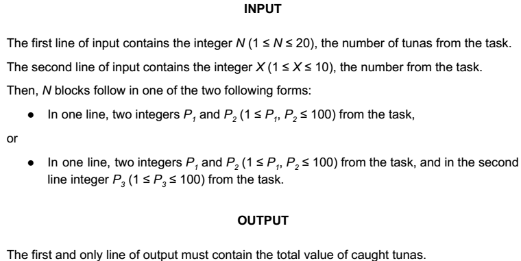 渔民抓住了n个金枪鱼,通过某个app卖给一家日本公司。这个app根据每只鱼的情况,给出两个值p1和p2。如果差值小等于x,那么更高的价格被采纳,如果差值确实大于x,那么app给出一个值p3,作为最终的采纳价格。写一个程序,根据给定的每只鱼的价格(有时是2个,有时是3个),给出抓住的鱼的总价格。