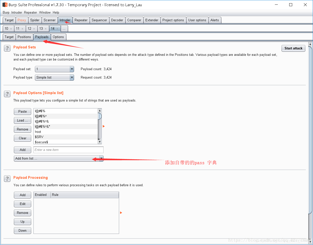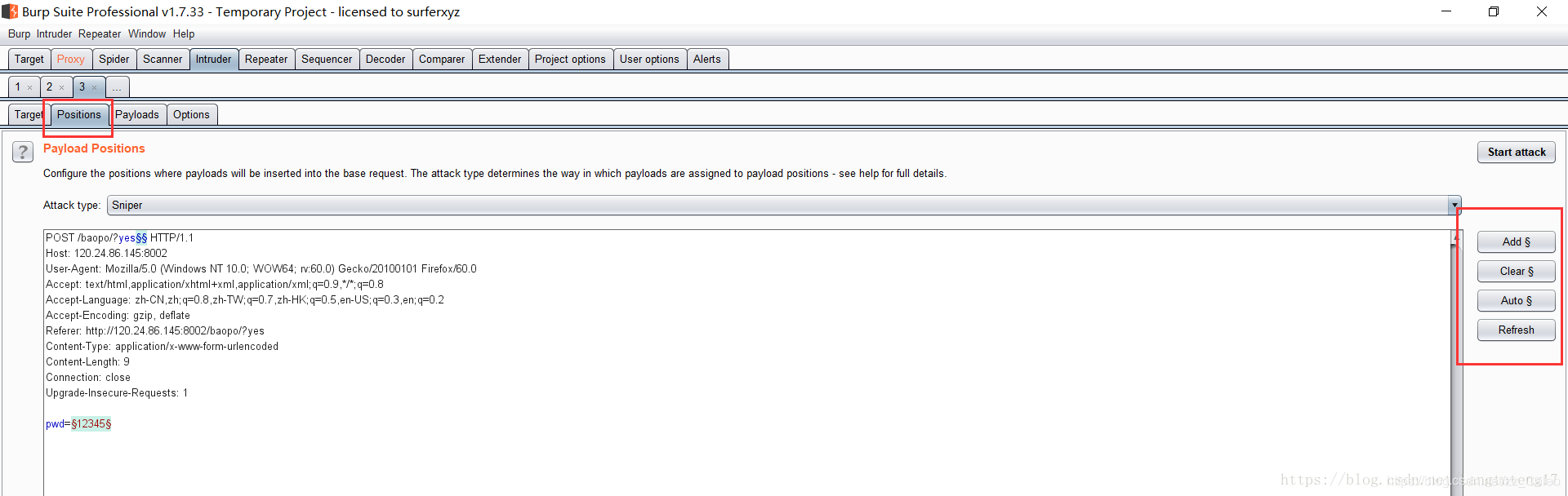在Positions中点击clear清除burp认为需要猜测的密码,然后选中12345(也就是我们刚才输入的密码,点击add)