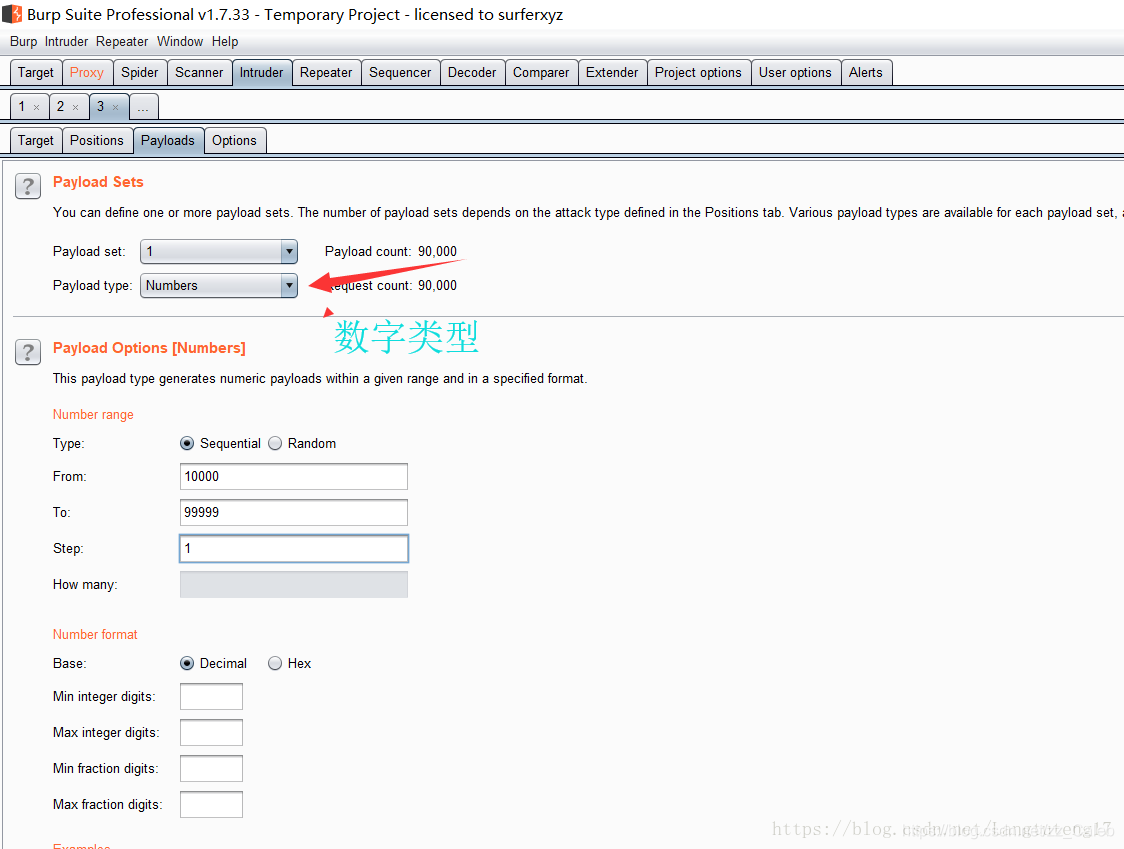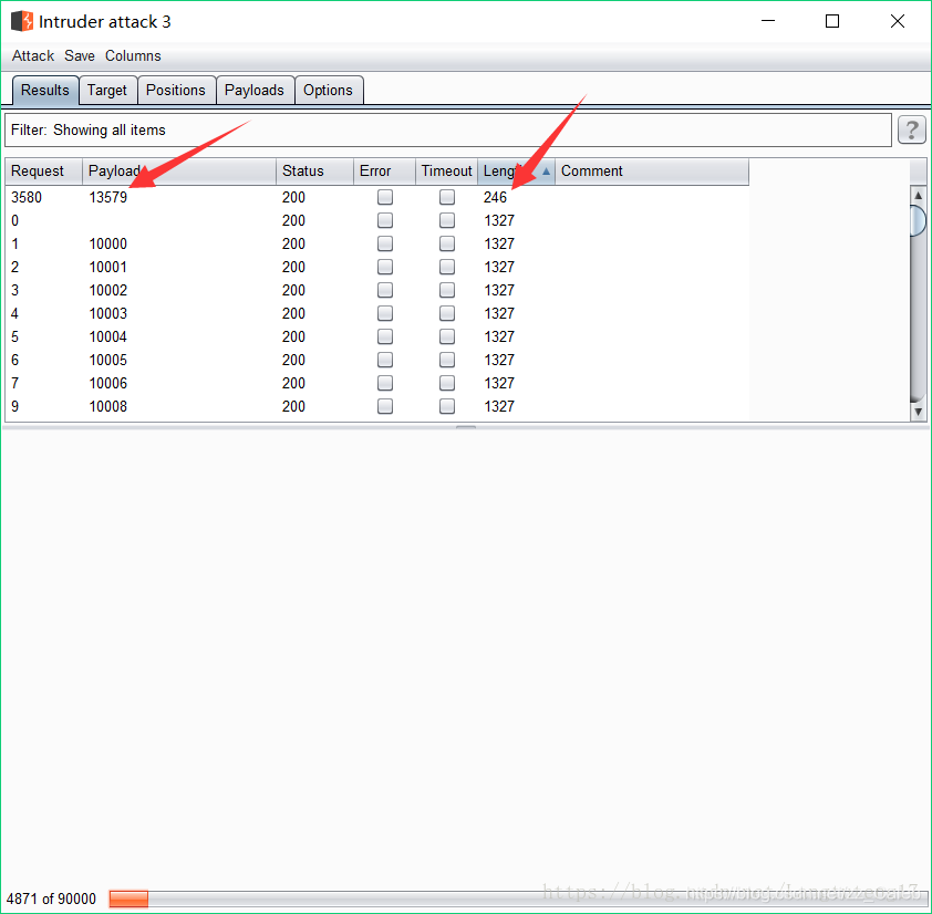 打开网页,由URL想到爆破,于是随便输入5个数字,用bp抓包,送到intruder中破解,