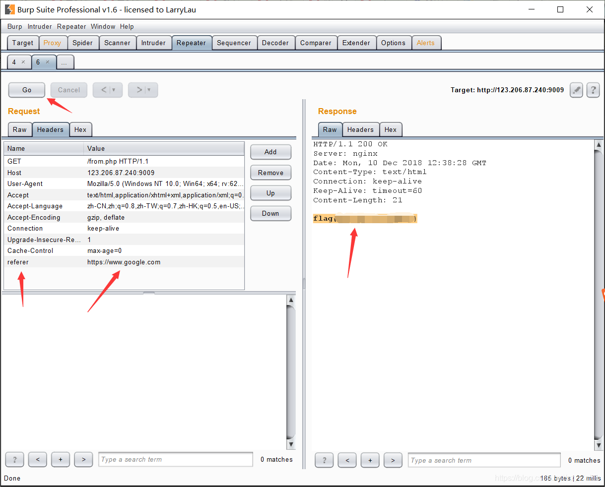 打开什么也没有,源码也什么也没有,于是用bp抓包,送到repeaterli,go一下,看到了flag。