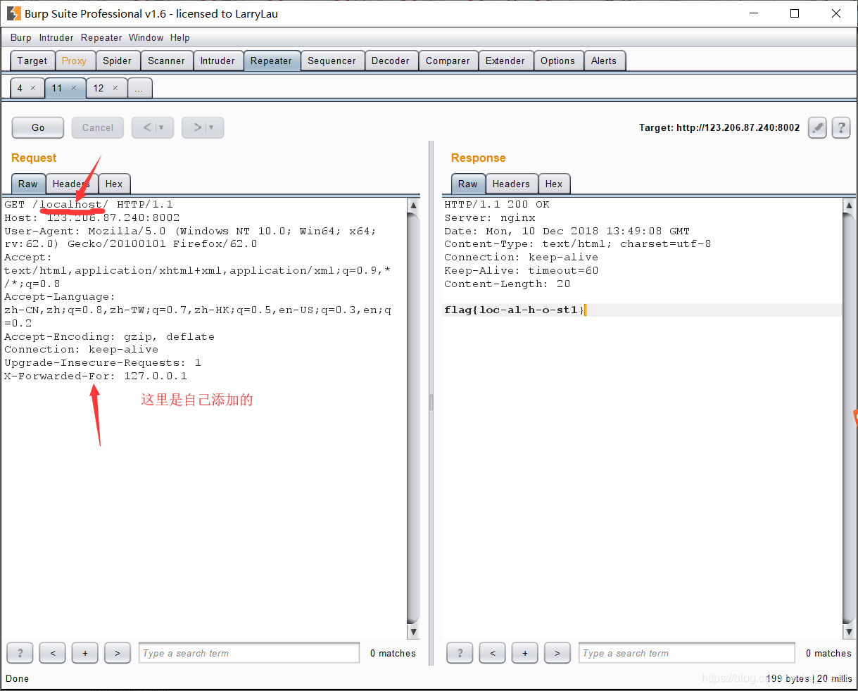 改包:Headers中增添一对键值对: X-Forwarded-For : 127.0.0.1