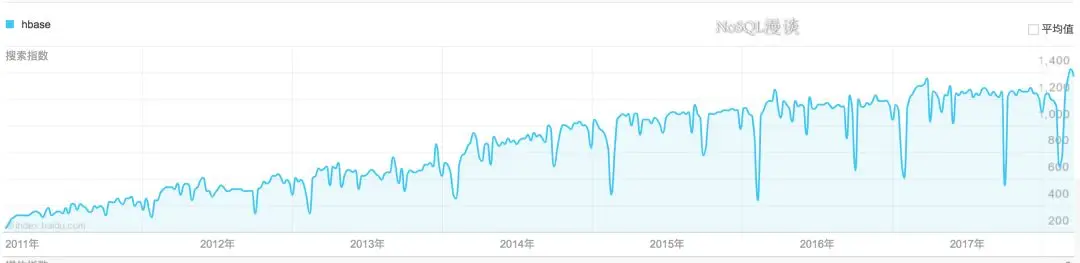HBase常被用来存放一些海量的(通常在TB级别以上)结构比较简单的数据,如历史订单记录,日志数据,监控Metris数据等等,HBase提供了简单的基于Key值的快速查询能力。HBase在国内市场已经取得了非常广泛的应用,在搜索引擎中,也可以看出来,HBase在国内呈现出了逐年上升的势态: