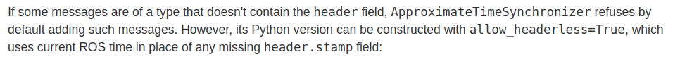 如果某些消息的类型不包含标头字段,则 ApproximateTimeSynchronizer 默认拒绝添加此类消息。 但是,它的 Python 版本可以使用 allow_headerless=True 构建,它使用当前的 ROS 时间代替任何缺失的 header.stamp 字段: