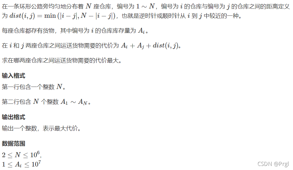 一个环路上的问题,考虑拆环为链然后复制一倍接在后面。那么对于Ai与Aj,不妨设j<i,如果i-j>N/2则两者距离在新的链上就是i-j,而如果i-j<=N/2那么两者之间的距离就是j+N-i=N-(i-j),而这个值<=N/2,所以二者的距离在新的链上一定不超过N/2。设新的链上两个物品为Ax与Ay,设y<x,可能的答案为Ax+Ay+ x-y=Ax+x+Ay-y,所以我们可以枚举x,用单调队列维护一下Ay-y,其在队列内单调递减,就可以求出答案了。