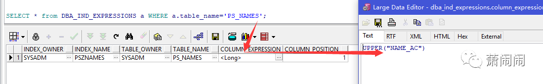 当您在表DBA_IND_COLUMNS中查看索引时,显示的类似是SYS_NC00033$,这是系统生生的列名,要找到真正的列名,要到表DBA_IND_EXPRESSIONS中的COLUMN_EXPRESSION列查看,如图: