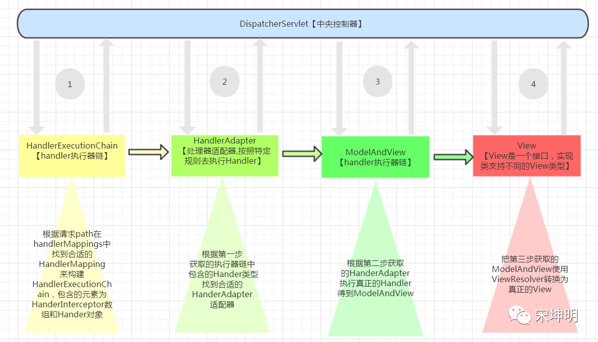 DispatcherServlet根据请求路径【path】去请求处理器映射器HandlerMappering,【HandlerMappering是在spring ioc容器加载时创建的,不了解的可以查看文章spring ioc & wb 宿主,创建时会遍历所有bean,把含有RequestMapping注解的方法和其value值建立映射关系】,所以现在可以根据path直接找到对应的handler【即controller中的某个标有RequestMapping注解的方法】,把hander和对应的HanderInterceptor【如果有】一起作为一个HandlerExecutionChain返回