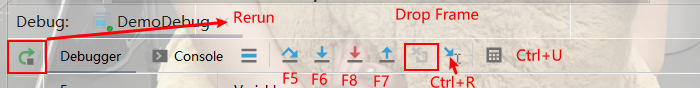 > Resume Program (F9):跳到下一个断点,如果没有下一个断点,就结束程序 。