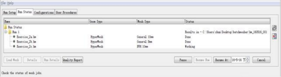 递交作业完成后,BatchMesher 将自动转到 Run Status Tab(作业监控面板),对正在进行的 BatchMesher作业进度及状态进行查询。每一个 BatchMesher 作业都拥有其专门的结果文件存储文件夹,您可以在作业监控面板下看到各文件夹名称及路径。