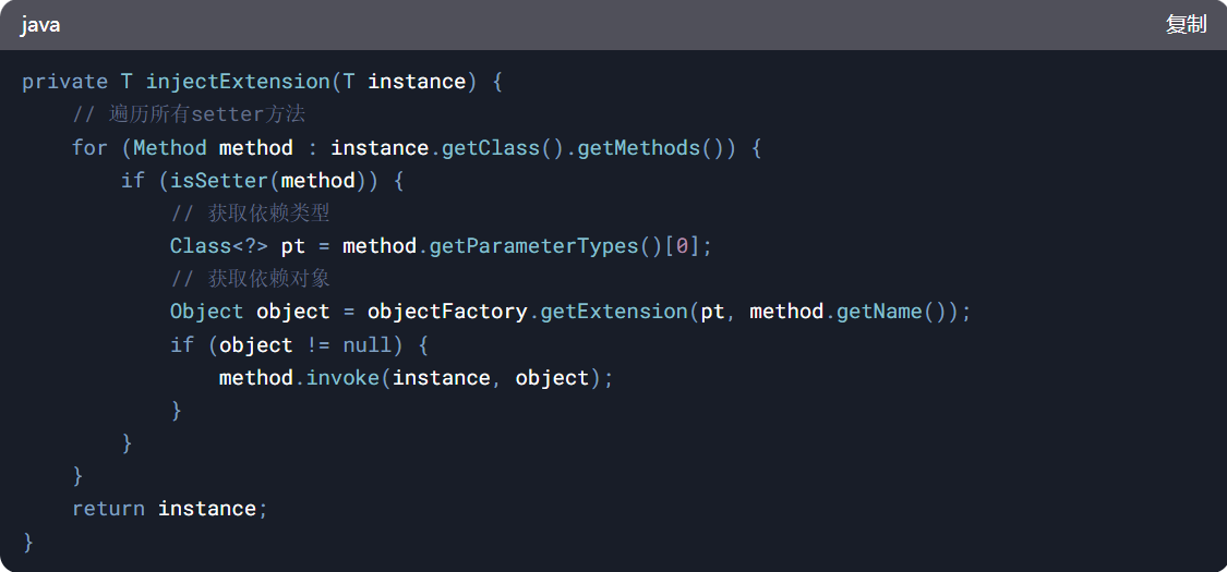 Dubbo 通过 injectExtension() 方法实现依赖注入:
