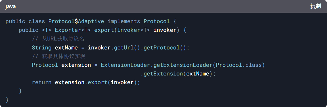 Dubbo 会为 @Adaptive 方法动态生成适配类,例如: