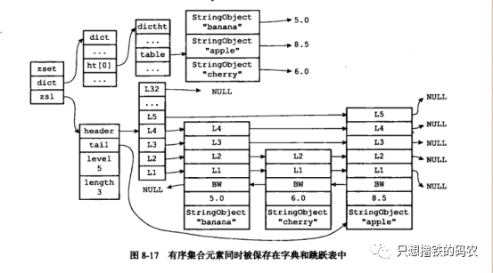 当不满足ziplist的两个条件的时候,使用的是skiplist,skiplist底层是zset结构,包含一个字典和一个跳跃表。