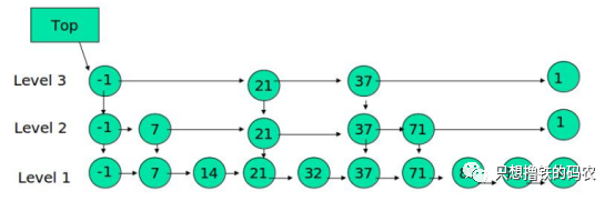 4>如果一个元素出现在某一层的链表中,那么在该层之下的链表也全都会出现(上一层的元素是当前层的元素的子集);