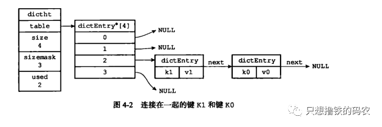 如果此时表中有一个entry的键为k0,插入键为k1的entry的时候,k1、k0它俩的hash值都一样,这时候就发生了哈希冲突,那么此时k1就会放在table中对应的索引下,k1的next就会指向k0,这个就是解决hash冲突的实现。