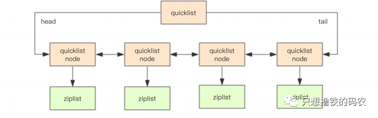 (1)redis的list数据类型的底层实现之一,类似于java集合类LinkedArrayList。