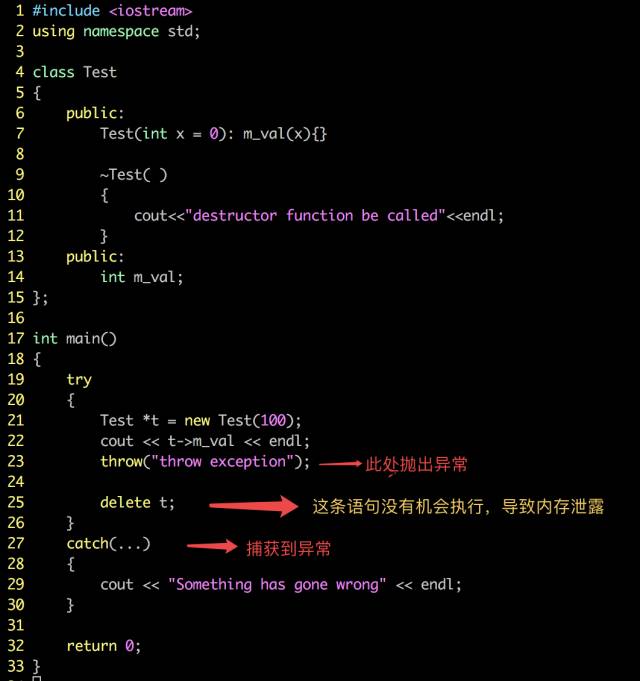 - 即使在malloc/new后显示调用了free/delete释放内存,但是由于异常可能会导致释放内存的free/delete语句得不到执行,也会发生内存泄露
