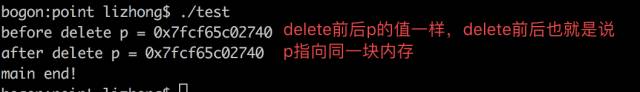 从运行结果来看,类的析构函数没有被执行,可推知delete语句并没有得到执行。
