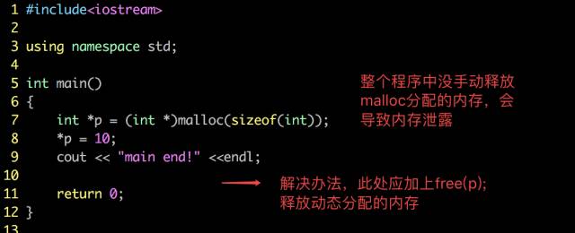 - 在C/C++中,通过动态内存分配函数(如malloc系统函数)或者new运算符分配的动态内存在使用完之后需要手动释放。否则会造成内存泄露。