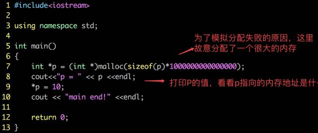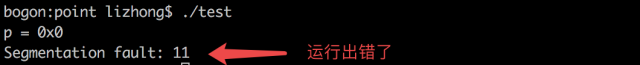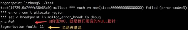 从程序运行结果来看,malloc分配失败返回NULL赋给p,再通过p访问其所指向的0地址内存内容时,出现"Segmentation fault"错误。