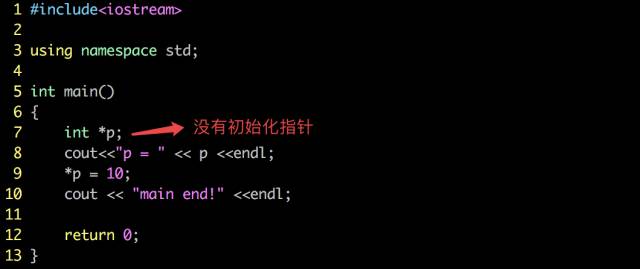 在创建指针变量p时忘了初始化,p的值是个随机的垃圾值,此时读写该指针都是危险的,程序会产生不确定的行为