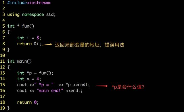 看看下面的例子,原本是想将fun函数中的变量i的地址返回给p,用p访问这个变量,这个打印出*p是32767,并不是变量i的值8。像这种bug,一旦在大的项目中出现是很难定位的。