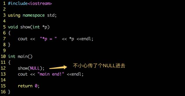 此外,在含有指针参数的函数,也是有可能会误用到NULL指针,当调用该函数时传递的指针是个空指针,如果没有if(p!=NULL) 的判断条件,那么在后面使用指针的时候麻烦就大了,下面的例子就是这种情况。