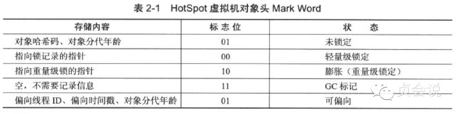 对象头第一部分用于存储对象自身的运行时数据,如哈希码(HashCode)、GC分代年龄、锁状态标志、线程持有的锁、偏向线程ID、偏向时间戳等,这部分数据的长度在32位和64位虚拟机(未开启压缩指针)中分别为32bit和64bit,官方称为“Mark Word”。对象需要存储的运行时数据很多,其实已经超出32位、64位所能记录的限度,考虑到虚拟机的空间效率,Mark Word设计成一个非固定的数据结构以便在极小的空间内存储尽量多的信息,它会根据对象的状态复用自己的存储空间。例如,在32位的HotSpot虚拟机中,如果对象处于未被锁定状态,那么Mark Word的32bit空间中的25bit用于存储对象哈希码,4bit用于存储对象分代年龄,2bit用于存储锁标志位,1bit固定为0,而在其他状态(轻量级锁定、重量级锁定、GC标记、可偏向)下对象的存储内容如下