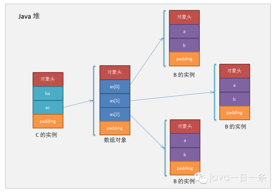 递归计算复合对象占用的内存的时候需要注意的是:对齐填充是以每个对象为单位进行的,看下面这个图就很容易明白。