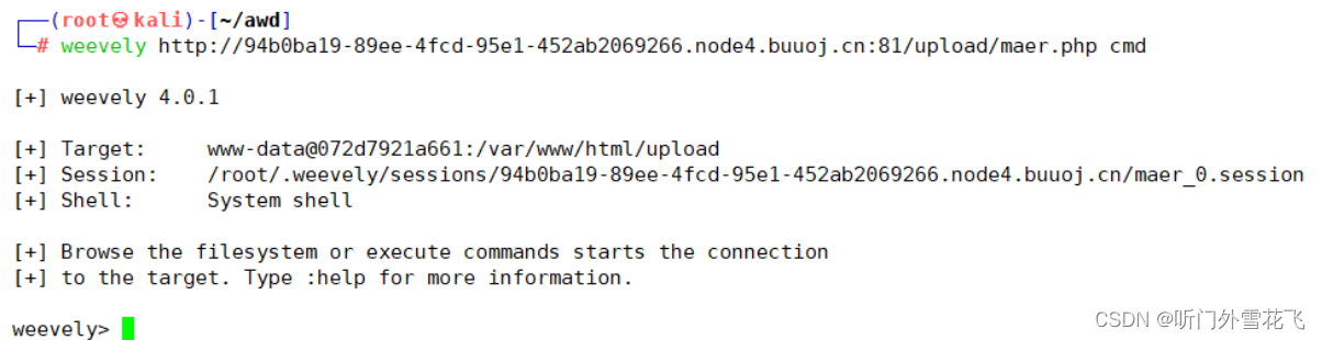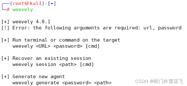 由于比赛不确定会不会提供菜刀或者蚁剑,这里我稍微对weevely进行简单介绍一下,具体还是请看官方文档,官方文档讲的很详细(前提你英语嘚不错)