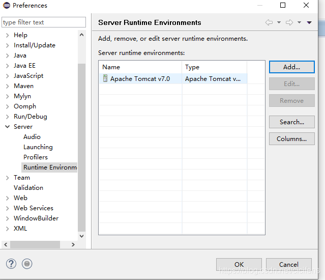 - Server->Runtime Environment->Add(因为我之前就弄过了所以这里就已经显示add了Tomcat v7.0啦 )