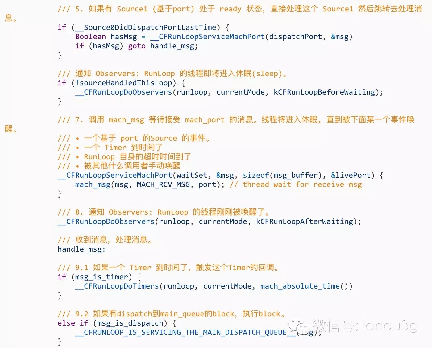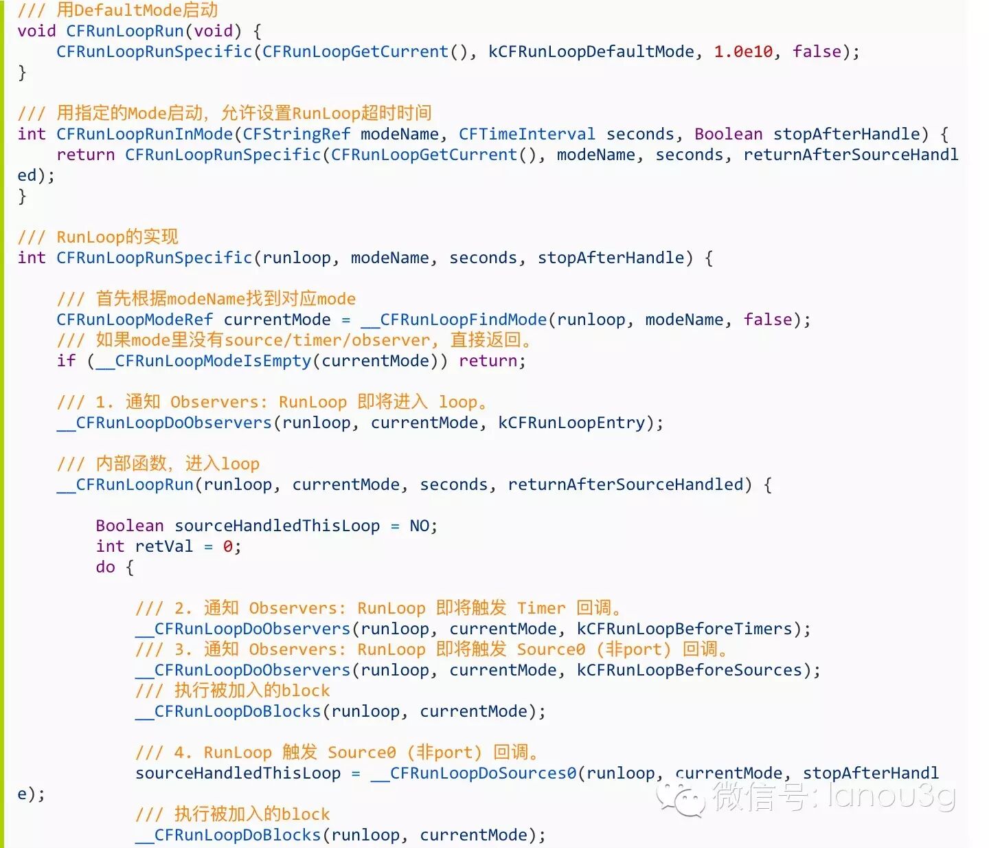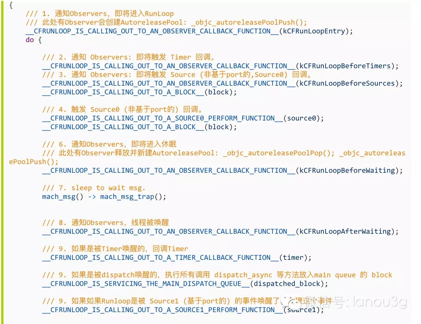 可以看到,实际上 RunLoop 就是这样一个函数,其内部是一个 do-while 循环。当你调用 CFRunLoopRun() 时,线程就会一直停留在这个循环里;直到超时或被手动停止,该函数才会返回。