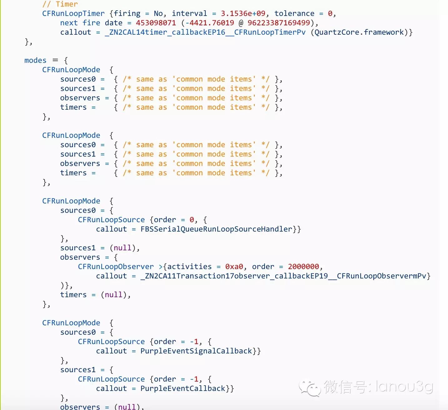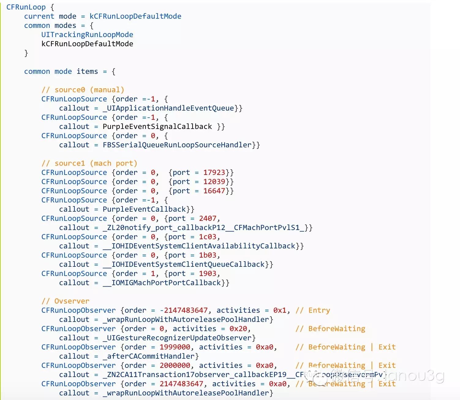 当 RunLoop 进行回调时,一般都是通过一个很长的函数调用出去 (call out), 当你在你的代码中下断点调试时,通常能在调用栈上看到这些函数。
