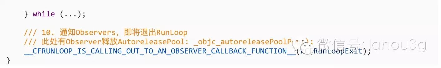 第二个 Observer 监视了两个事件: BeforeWaiting(准备进入休眠) 时调用objcautoreleasePoolPop() 和 objcautoreleasePoolPush() 释放旧的池并创建新池;Exit(即将退出Loop) 时调用 objcautoreleasePoolPop() 来释放自动释放池。
