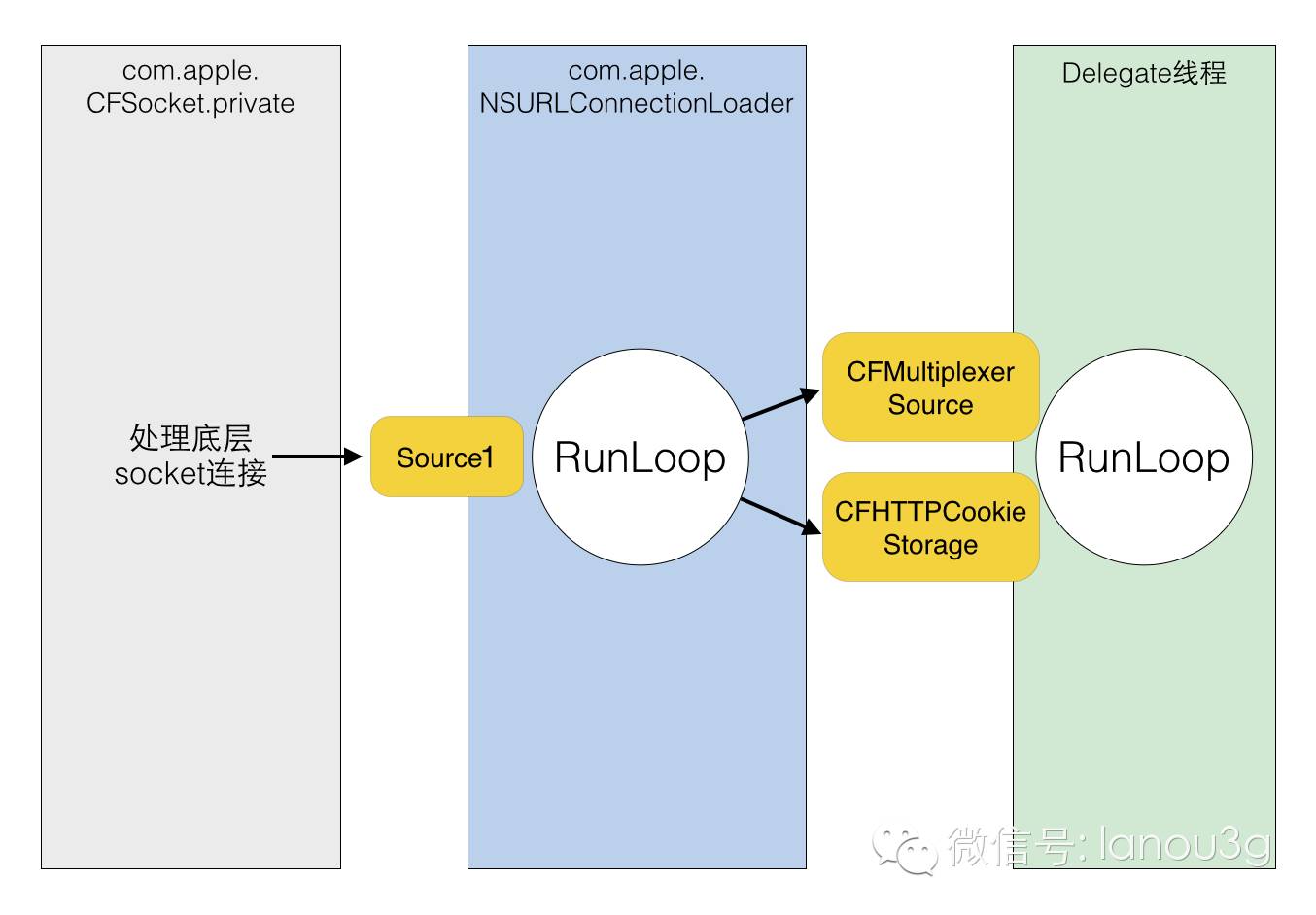 NSURLConnectionLoader 这个线程内部会使用 RunLoop 来接收底层 socket 的事件,并通过之前添加的 Source0 通知到上层的 Delegate。
