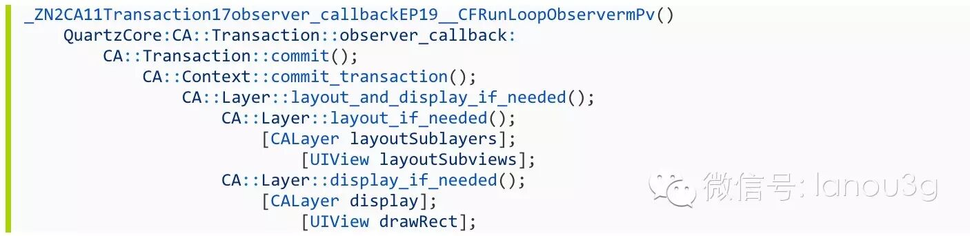 苹果注册了一个 Observer 监听 BeforeWaiting(即将进入休眠) 和 Exit (即将退出Loop) 事件,回调去执行一个很长的函数:ZN2CA11Transaction17observercallbackEP19__CFRunLoopObservermPv()。这个函数里会遍历所有待处理的 UIView/CAlayer 以执行实际的绘制和调整,并更新 UI 界面。