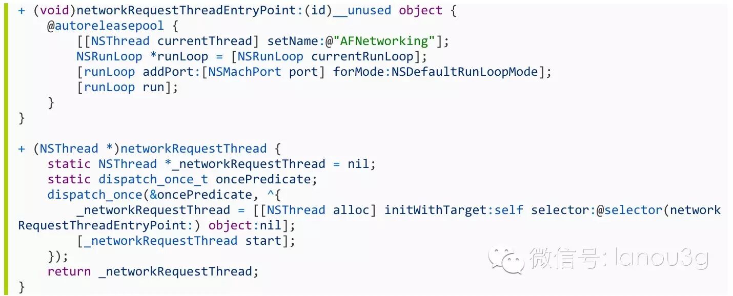 AFURLConnectionOperation 这个类是基于 NSURLConnection 构建的,其希望能在后台线程接收 Delegate 回调。为此 AFNetworking 单独创建了一个线程,并在这个线程中启动了一个 RunLoop: