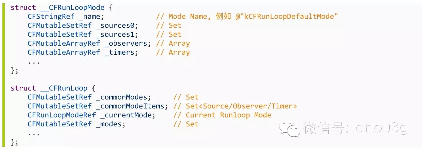苹果公开提供的 Mode 有两个:kCFRunLoopDefaultMode (NSDefaultRunLoopMode) 和 UITrackingRunLoopMode,你可以用这两个 Mode Name 来操作其对应的 Mode。