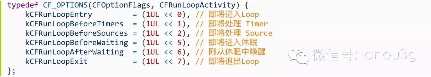 CFRunLoopObserverRef 是观察者,每个 Observer 都包含了一个回调(函数指针),当 RunLoop 的状态发生变化时,观察者就能通过回调接受到这个变化。可以观测的时间点有以下几个: