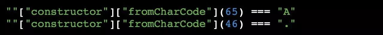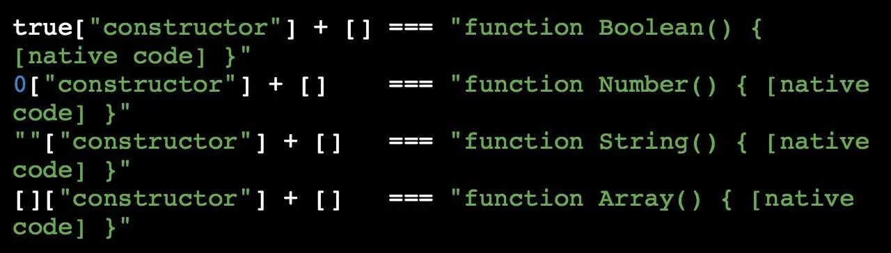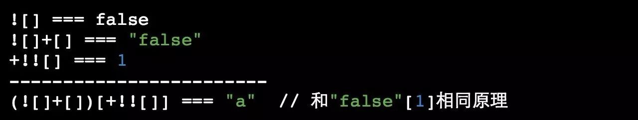 所以,我们利用上述字符的一些简单组合就可以得到「 true 」和「 false 」中的字母,比如「 t 」「 r 」「 u 」「 e 」「 f 」「 a 」「 l 」「 s 」。那么我们可以得到其他字母吗?