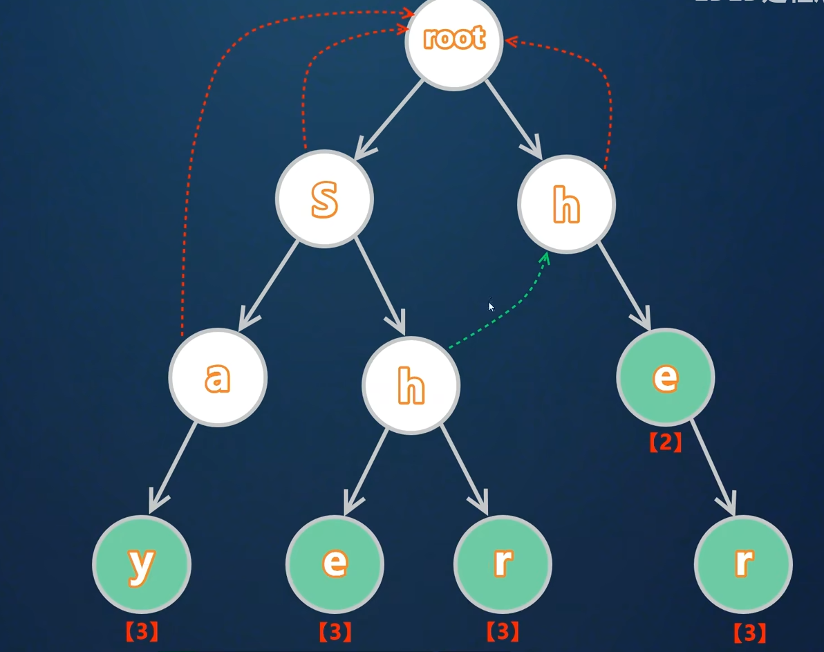 如果当前节点父节点的fail指针指向的节点下存在与当前节点一样的子节点,则当前节点的fail指针指向该子节点,否则指向root节点。