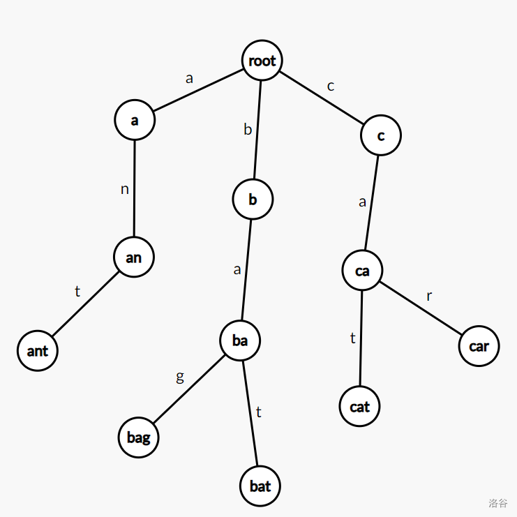 如果需要在这棵树中查询,就必须要创建这棵树。如果我们要存储 \(ant,bag,bat,cat,car\) 这五个字符串,那么这棵树长这样子: