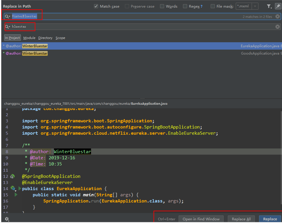 ctrl + shift + r: 在路径中替换,指的是在选定的目录下或者类包下,查找要被替换的字符,再在第二个输入框中输入要替换的字符,点击弹出框的右下角的replace或者replaceall即可。考虑到个人工作习惯,经常自定义快捷键,当前的这个快捷键有可能已经不是阁下使用的,不过不要紧,关键记住“Replach in Path” 这个功能名称,在自己的keyMap里面查找即可。