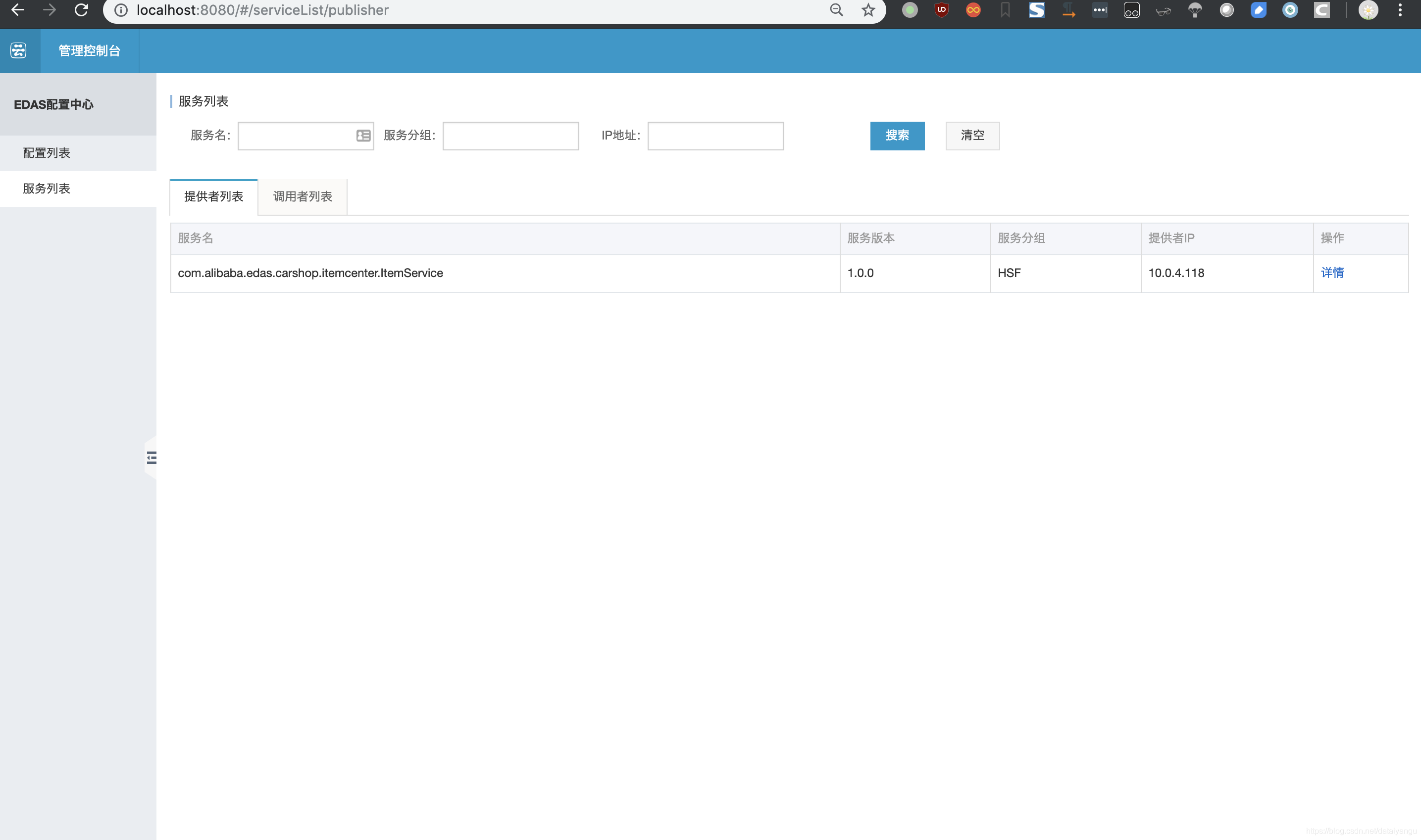 在开发调试的过程中,如果您的服务是通过轻量配置中心进行服务注册与发现,就可以通过 EDAS 控制台查询某个应用提供或调用的服务。